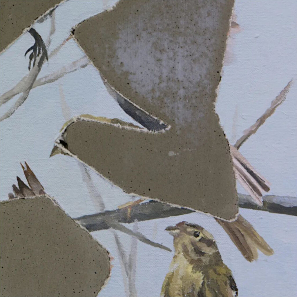 ”Olen irrottanut sähkösahalla vanhoja lintukuviani, jotka on murskattu raa’asti soraksi betonin sisään. Alun perin suurella taidolla ja antaumuksella tuotetun teoksen karkea käsittely nostaa esiin kysymyksen maalauksen koskemattomuudesta: miksi tuntuu niin ’väärältä’, kun jo maalatusta pinnasta sahataan irti kappale? Myös betoniin valetut ja soraksi murskatut lintukuvat ohjaavat huomiomme ympärillämme oleviin materiaaleihin: mistä ympäröivä maailmamme on rakennettu ja miten reagoimme siihen?”